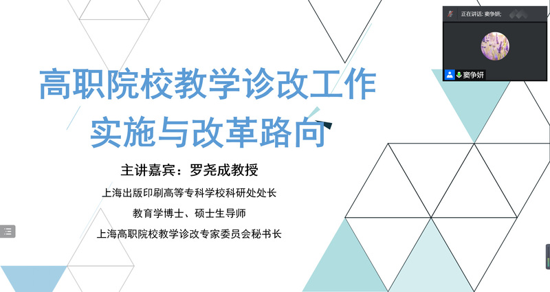 为强化学校教师及管理人员诊改意识,理清诊改工作思路,把握诊改工作动向,5月19日晚上,质量管理处邀请到上海高职院校教学诊改专家委员会秘书长罗尧成教授作了题为“高职院校教学诊改工作实施与改革路向”的线上专题讲座,校内外100多名教师参与培训。讲座由窦争妍副校长主持。